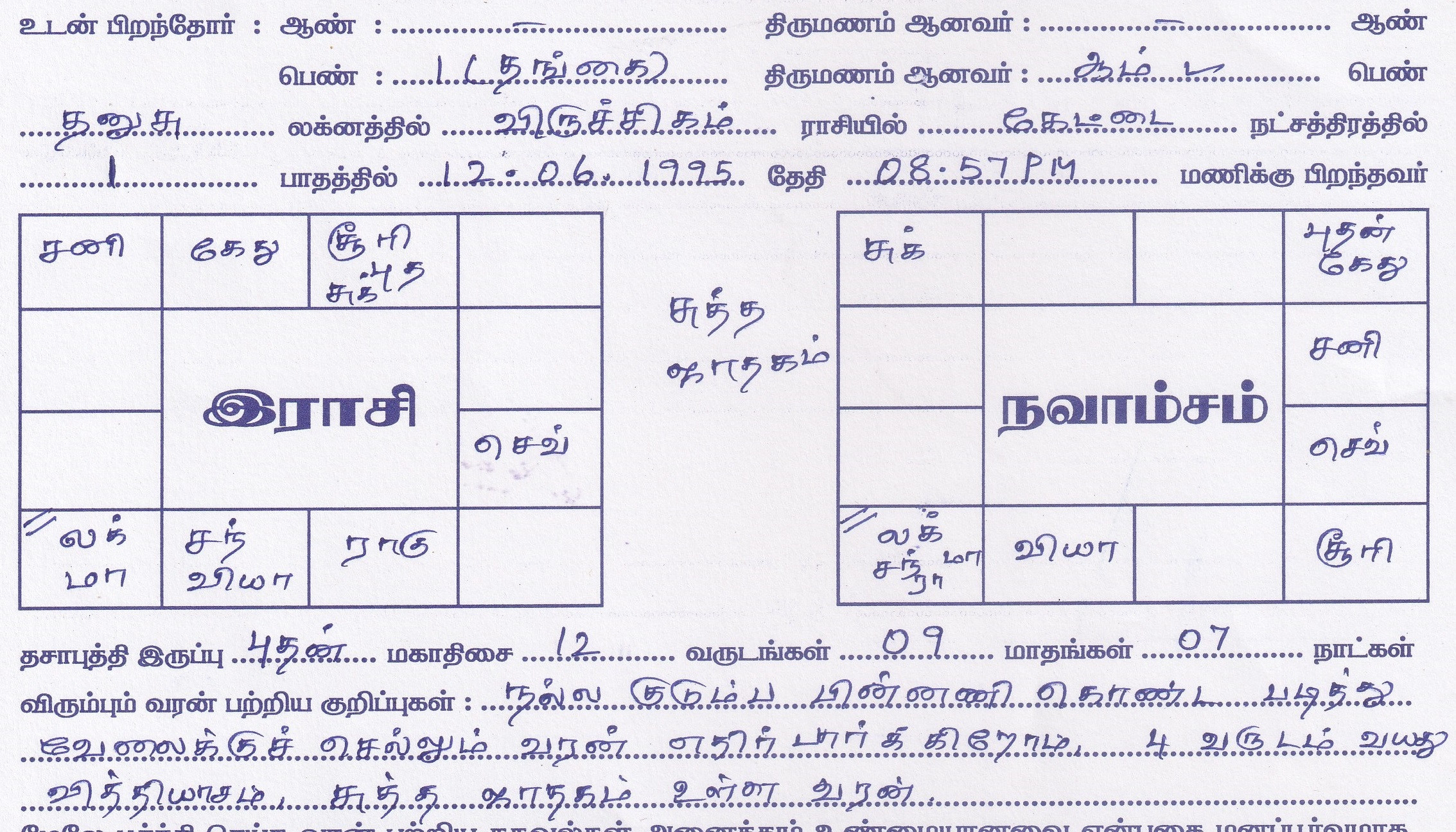 | Occupation | : EDUCATED, GOOD JOB, GOOD FAMILY, AGE DIFFERENCE UPTO 4 YEARS, SUTHTHA JADHAGAM |
