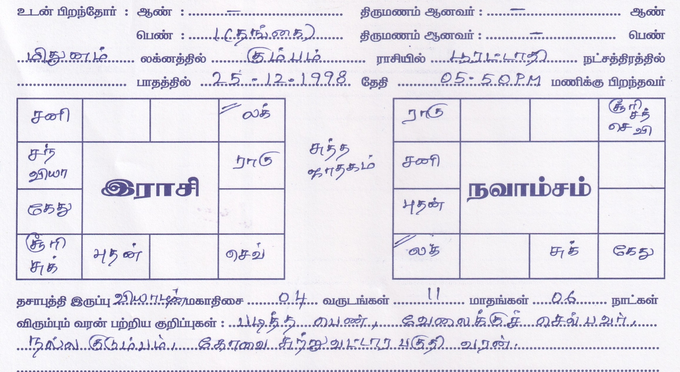 | Mother Tongue | : Tamil |