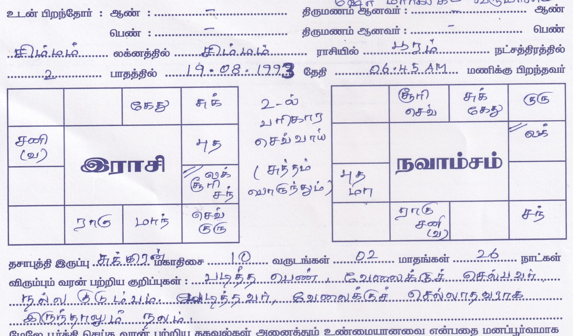 | Mother Tongue | : Tamil |