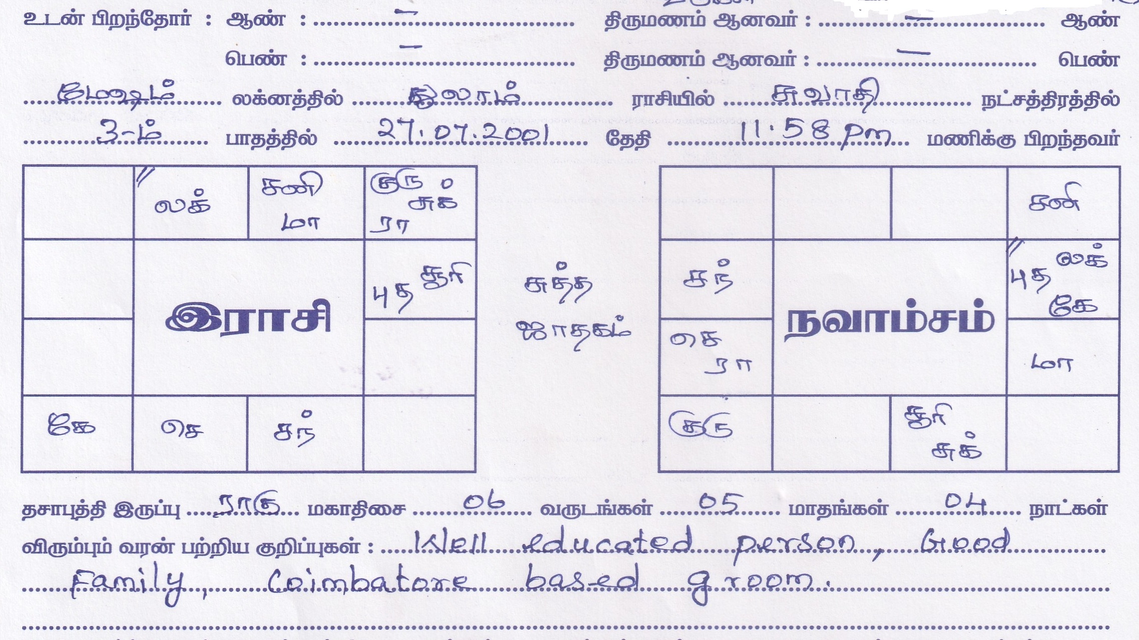 | Occupation | : WELL EDUCATED, GOOD FAMILY, COIMBATORE BASED GROOM |
