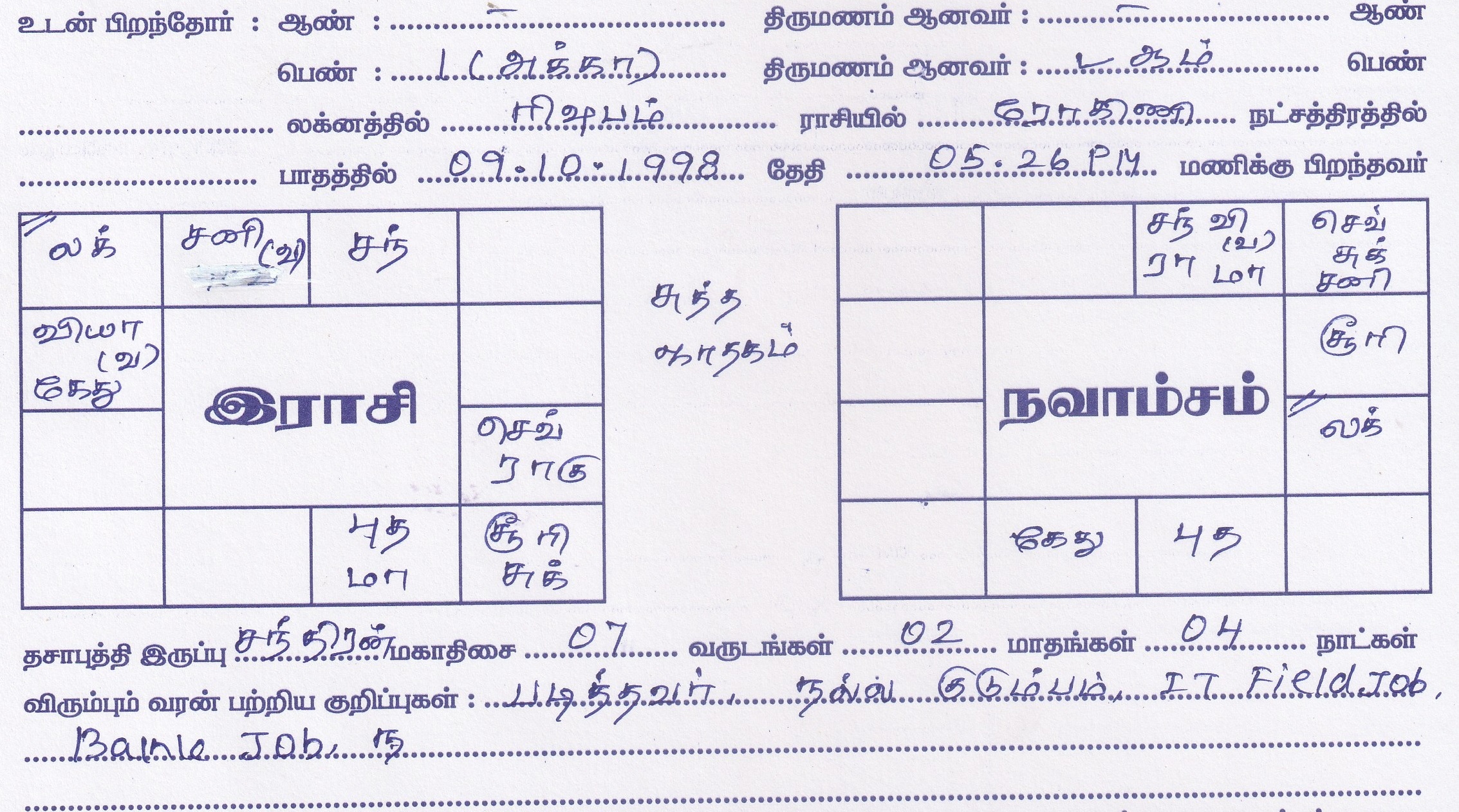 | Sub Caste | :FATHER & MOTHER INTER CASTE MARRIAGE (FATHER - VISWAKARMA,MOTHER-MUDALIYAR) |