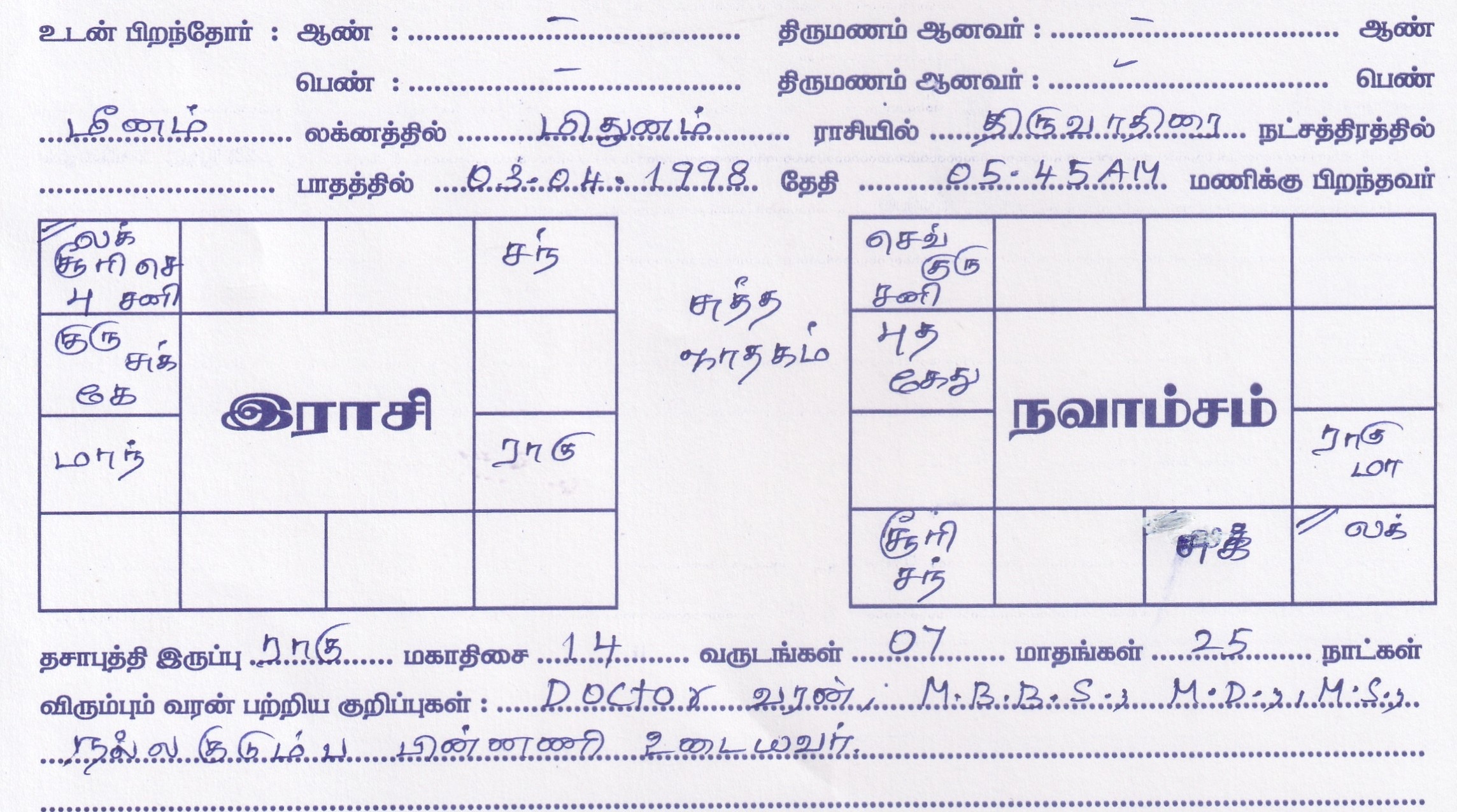 | Occupation | : DOCTOR ALLIANCE,M.B.B.S.,M.D.,M.S.,,GOOD FAMILY BACKGROUND |
